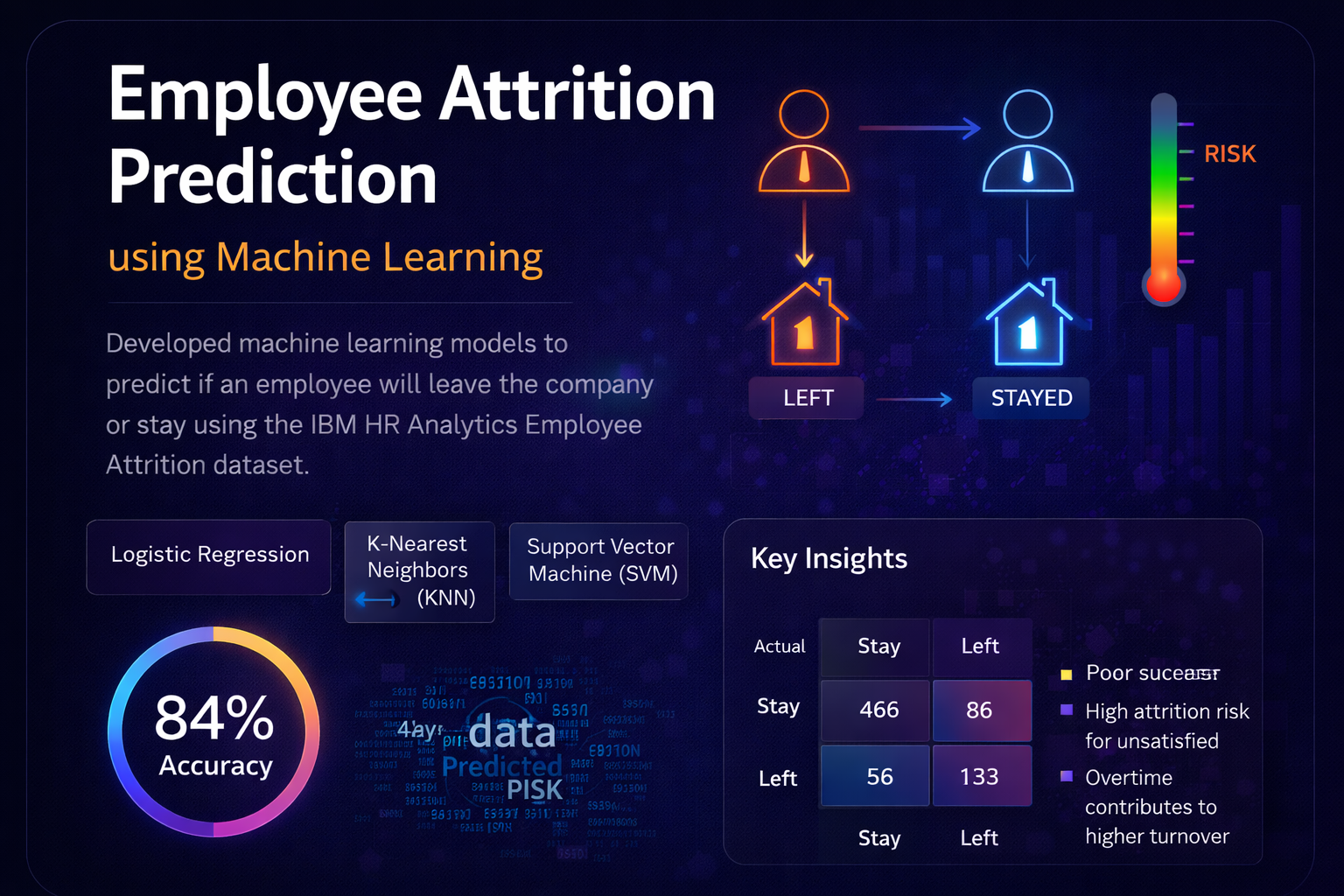 Developed machine learning models to predict employee attrition using the IBM HR dataset. Implemented Logistic Regression, KNN, and SVM with preprocessing, feature encoding, and scaling. Evaluated performance using accuracy and classification metrics.