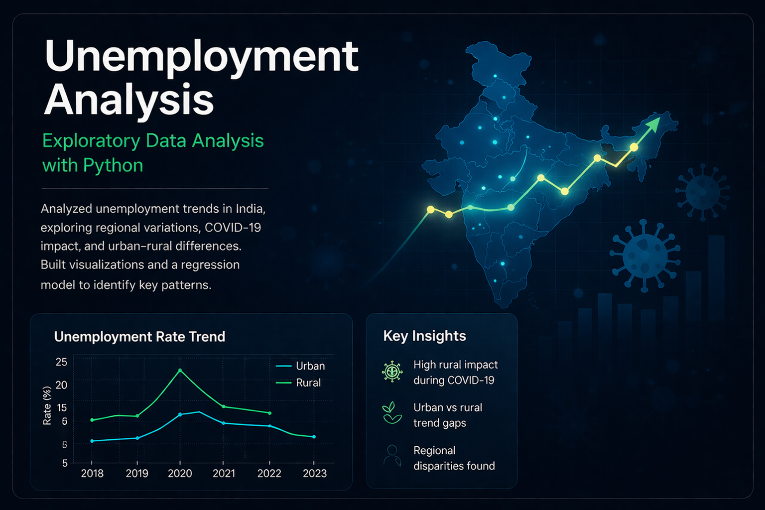 Analyzed unemployment trends in India by studying regional variations, COVID-19 impact, and urban–rural differences. Applied data cleaning, visualization, and regression modeling to identify patterns over time.